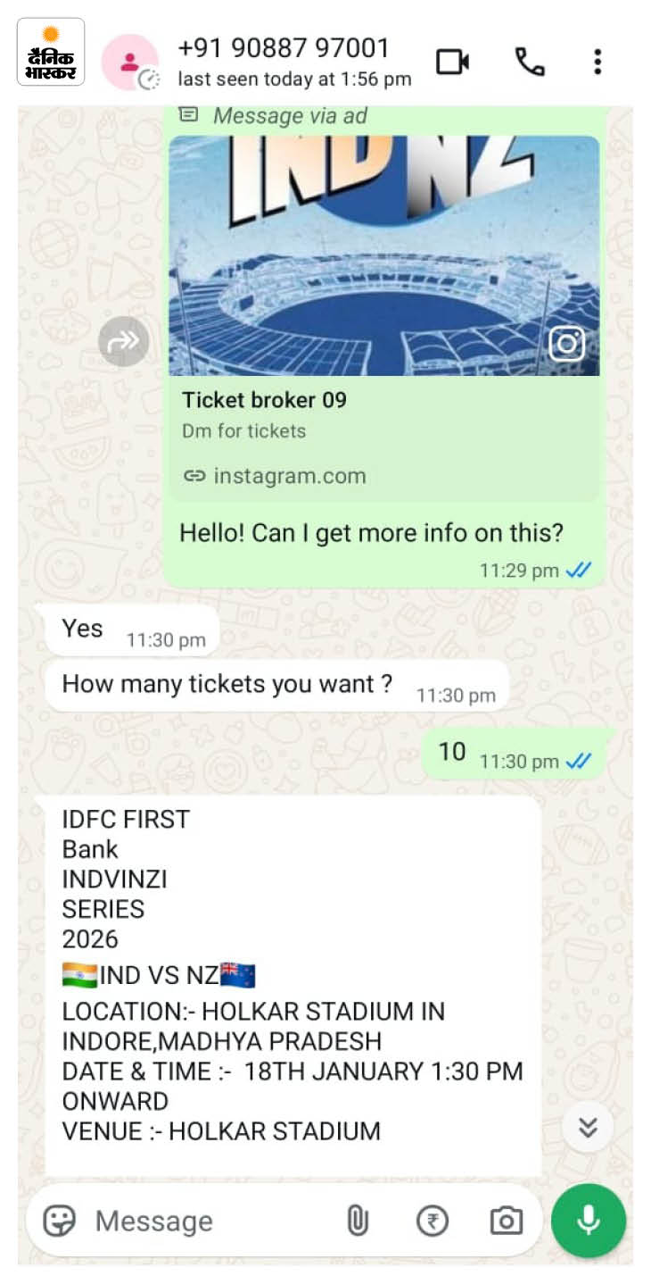 …जब भास्कर रिपोर्टर बना ग्राहक मैच के टिकटों की भारी किल्लत के बीच, हमारी टीम ने सोशल मीडिया प्लेटफॉर्म्स, खासकर इंस्टाग्राम पर सक्रिय उन अकाउंट्स की जांच शुरू की, जो आसानी से टिकट उपलब्ध कराने का दावा कर रहे थे। इस दौरान पांच से अधिक अलग-अलग लोगों से बातचीत हुई, जिसमें एडवांस पेमेंट, बड़ी संख्या में टिकटों का लालच और विश्वास जीतने के लिए फर्जी स्क्रीनशॉट दिखाने जैसे तरीके प्रमुख रूप से सामने आए।