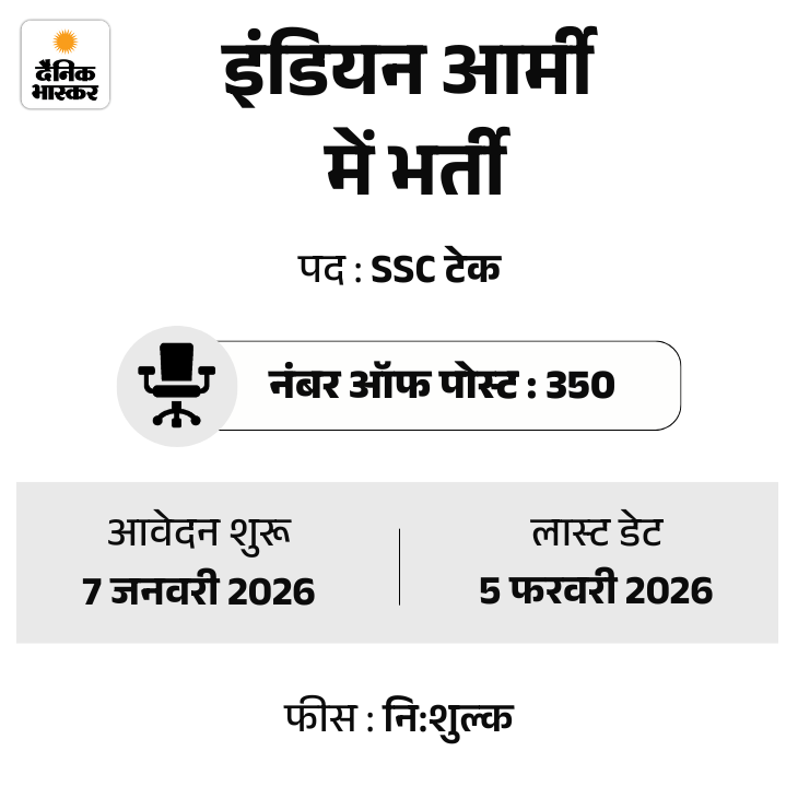 इंडियन आर्मी ने शॉर्ट सर्विस कमीशन (टेक्निकल) भर्ती 2026 का नोटिफिकेशन जारी कर दिया है। इसके तहत कुल 350 पदों पर भर्ती होनी हैं। इन पदों के लिए आवेदन की प्रक्रिया शुरू हो गई है। कैंडिडेट ऑफिशियल वेबसाइट joinindianarmy.nic.in पर जाकर अप्लाई कर सकते हैं। इसके लिए आवेदन की लास्ट डेट 5 फरवरी तय की गई है।