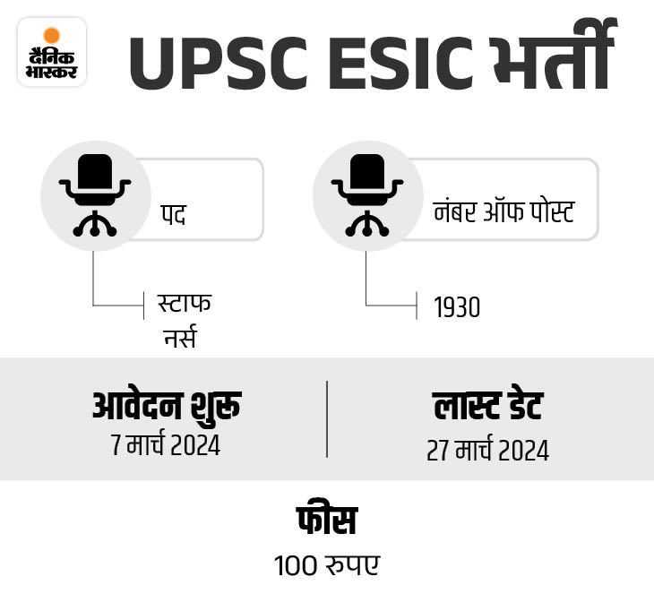संघ लोक सेवा आयोग (UPSC) द्वारा केंद्रीय श्रम एवं रोजगार मंत्रालय के अधीन कर्मचारी राज्य बीमा निगम (ESIC) में नर्सिंग ऑफिसर के पदों पर भर्ती के लिए आवेदन 7 मार्च से जारी हैं। उम्मीदवारों के लिए अप्लाय करने की लास्ट डेट 27 मार्च तय की गई है।