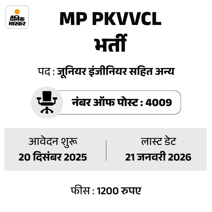 मध्यप्रदेश पश्चिम क्षेत्र विद्युत वितरण कंपनी लिमिटेड ने 4 हजार से ज्यादा पदों पर भर्ती निकाली है। इस भर्ती के लिए आवेदन की आखिरी तारीख 21 जनवरी तय की गई है। उम्मीदवार ऑफिशियल वेबसाइट mpwz.co.in पर जाकर अप्लाई कर सकते हैं।