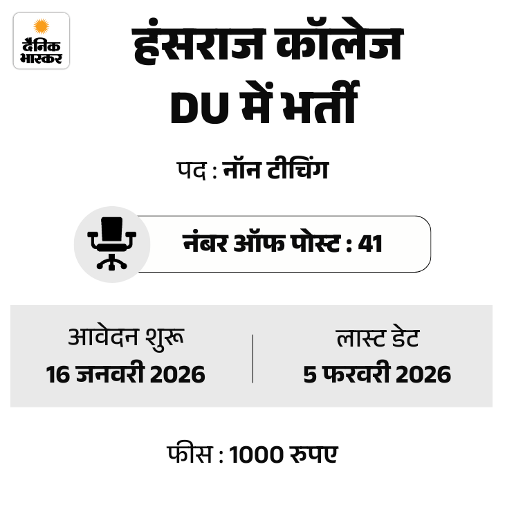 दिल्ली विश्वविद्यालय के हंसराज कॉलेज में नॉन टीचिंग के 41 पदों पर भर्ती निकली है। उम्मीदवार कॉलेज की ऑफिशियल वेबसाइट hansrajcollege.ac.in पर जाकर अप्लाई कर सकते हैं।