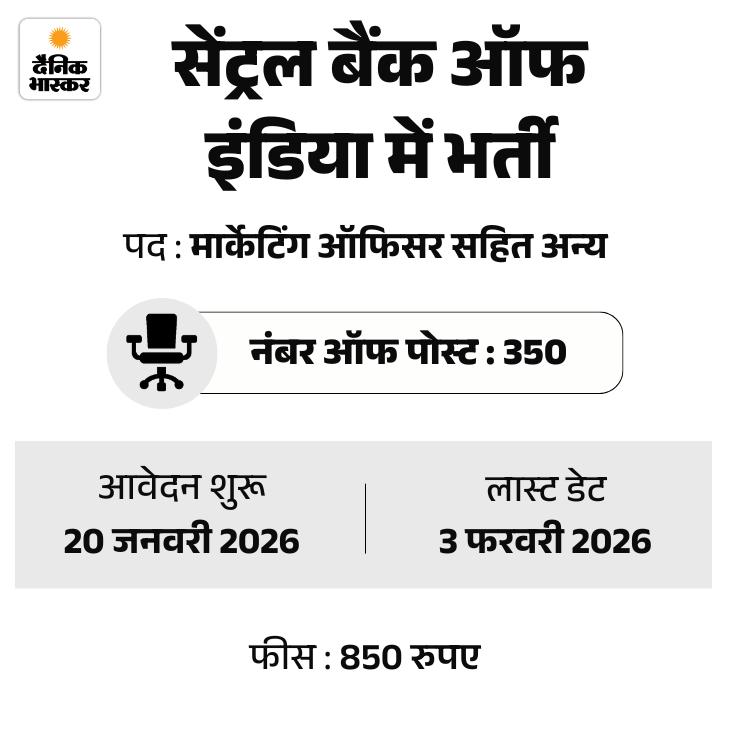 सेंट्रल बैंक ऑफ इंडिया में फॉरेन एक्सचेंज ऑफिसर और मार्केटिंग ऑफिसर के पदों पर भर्ती निकली है। उम्मीदवार ऑफिशियल वेबसाइट centralbankofindia.co.in पर जाकर अप्लाई कर सकते हैं। फीस जमा करने की आखिरी तारीख भी 3 फरवरी 2026 तय की गई है।