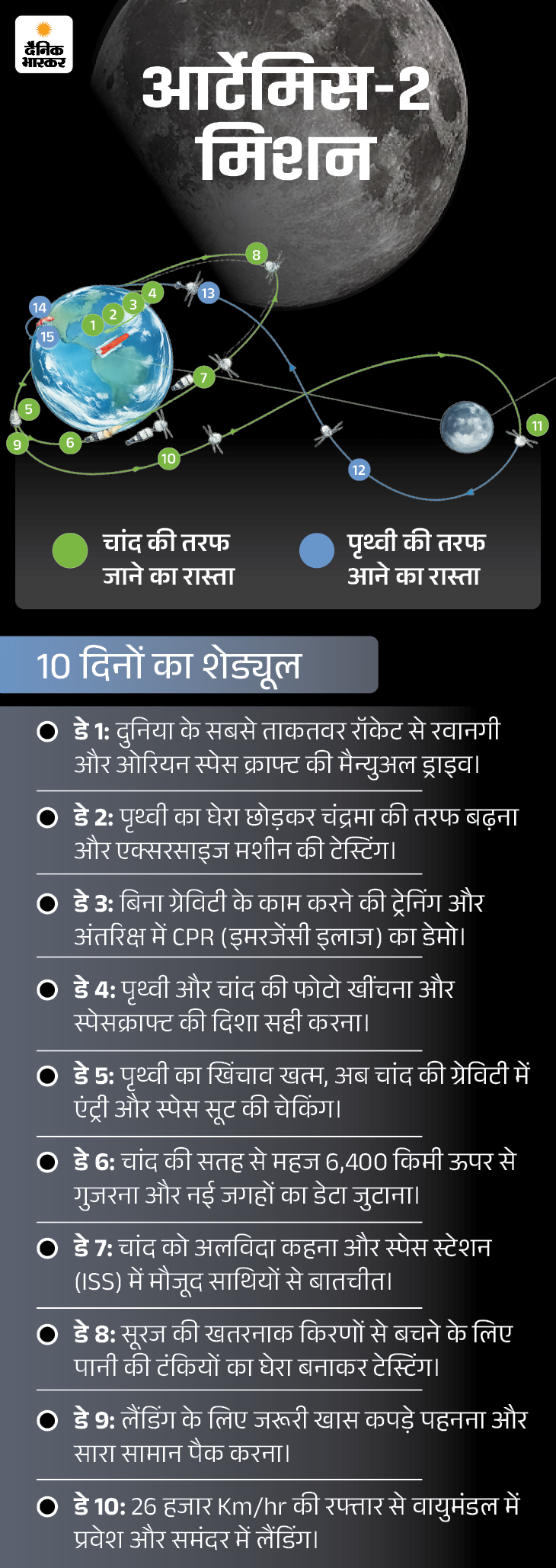 यह चांद के गुरुत्वाकर्षण का इस्तेमाल ‘गुलेल’ की तरह करेगा, जो यान को वापस पृथ्वी की ओर धकेल देगा। पूरे मिशन में चारों अंतरिक्ष यात्री करीब 11.02 लाख किमी का सफर तय करेंगे।