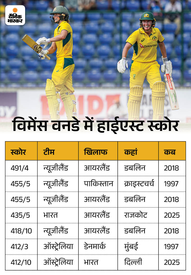 ऑस्ट्रेलिया ने अपने बेस्ट स्कोर की बराबरी की ऑस्ट्रेलिया विमेंस ने वनडे में दूसरी बार ही 400 रन का आंकड़ा पार किया। टीम 1997 में डेनमार्क के खिलाफ भी 412 रन ही बना चुकी हैं। विमेंस क्रिकेट में न्यूजीलैंड ने 4 और भारत ने 1 बार 400 से ज्यादा रन बनाए हैं। टॉप-3 स्कोर न्यूजीलैंड के नाम हैं। टीम ने 2018 में आयरलैंड के खिलाफ 491 रन बनाए थे, यह हाईएस्ट स्कोर है।