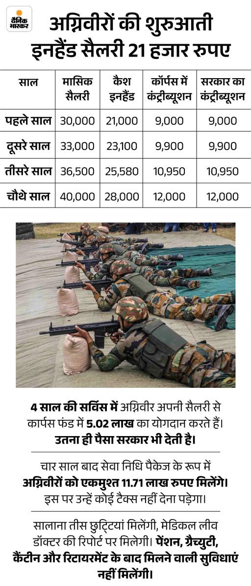 सरकार ने 2022 में अग्निपथ स्कीम लॉन्च की थी। इसके तहत आर्मी, नेवी और एयर फोर्स में चार साल के लिए नौजवानों को कॉन्ट्रैक्ट पर भर्ती किया जाता है। 4 साल में छह महीने की ट्रेनिंग भी शामिल है। चार साल बाद अग्निवीरों को उनकी कार्यक्षमता के आधार पर रेटिंग दी जाएगी। इसी मेरिट के आधार पर 25% अग्निवीरों को परमानेंट सर्विस में लिया जाएगा। बाकी लोग वापस सिविल दुनिया में आ जाएंगे।