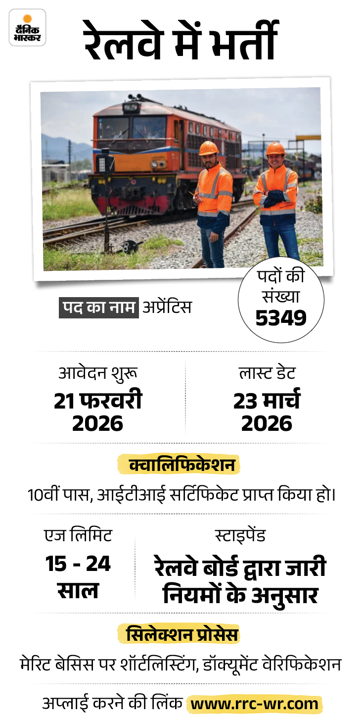 आज की सरकारी नौकरी: रेलवे में अप्रेंटिस के 5349 पदों पर निकली भर्ती; 10वीं पास को मौका, बिना एग्जाम, इंटरव्यू के सिलेक्शन