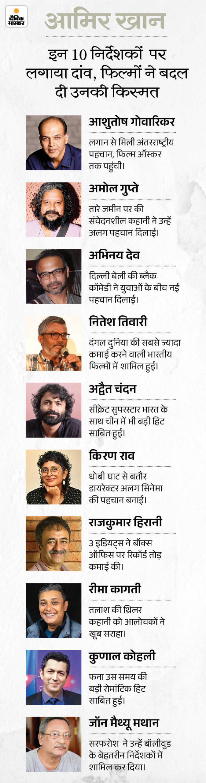 जॉन मैथ्यू मथान ने सरफरोश से निर्देशन की शुरुआत की और फिल्म बड़ी हिट रही। किरण राव की धोबी घाट और अद्वैत चंदन की सीक्रेट सुपरस्टार भी डेब्यू फिल्में थीं। वहीं आशुतोष गोवारिकर की लगान, नितेश तिवारी की दंगल, रीमा कागती की तलाश, कुणाल कोहली की फना और अभिनय देव की दिल्ली बेली, राजकुमार हिरानी की 3 इडियट्स,जैसी फिल्मों ने उन्हें बड़ी पहचान दिलाई।