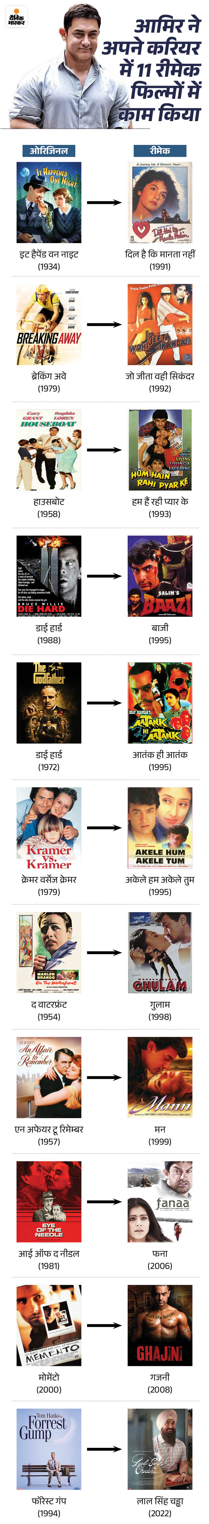 शायद यही वजह है कि अपने चार दशक लंबे करियर में भी आमिर लगातार नए प्रयोग करते रहे हैं। यही सोच उन्हें अलग बनाती है, और इसी दौरान उन्होंने अपने करियर में 11 रीमेक फिल्मों में भी काम किया है।