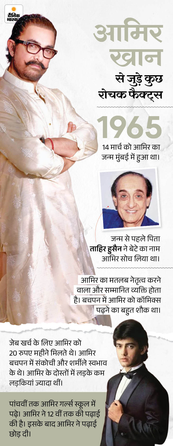 8 साल की उम्र में फिल्म ‘यादों की बारात’ से चाइल्ड आर्टिस्ट के तौर पर कैमरे के सामने आने वाले आमिर ने आगे चलकर ‘लगान’, ‘गजनी’, ‘3 इडियट्स’ और ‘दंगल’ जैसी फिल्मों से अपनी अलग पहचान बनाई।