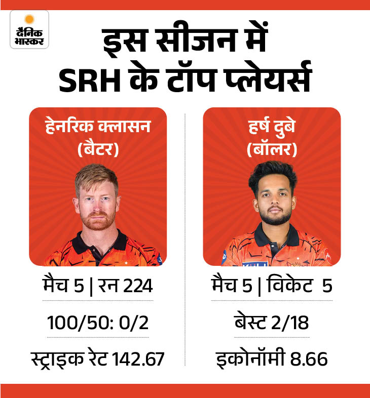 SRH के लिए इस सीजन में हेनरिक क्लासन ने सबसे ज्यादा रन बनाए हैं। उन्होंने 5 मैचों में 200 से ज्यादा रन बनाए हैं, जिसमें 2 अर्धशतक शामिल हैं। उनका स्ट्राइक रेट 142.67 रहा है, जिससे मिडिल ऑर्डर को मजबूती मिली है। वहीं गेंदबाजी में हर्ष दुबे ने अहम भूमिका निभाई है। उन्होंने 5 मैचों में 5 विकेट लिए हैं। टीम के पिछले मैच में अपना डेब्यू कर रहे तेज गेंदबाज प्रफुल हिंगे और साकिब हुसैन ने 4-4 विकेट लिए थे।