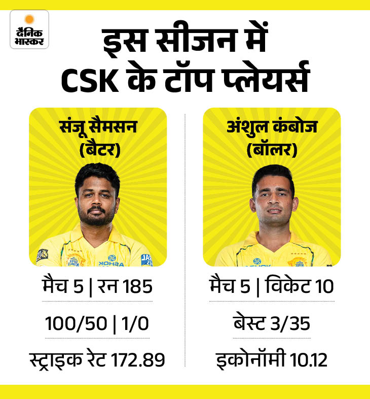 CSK के लिए इस सीजन में संजू सैमसन बेहतरीन लय में दिखे हैं। उन्होंने 5 मैचों में 185 रन बनाए हैं, जिसमें एक शतक शामिल है। उन्होंने दिल्ली कैपिटल्स के खिलाफ नाबाद 115 रन बनाए थे। दूसरी ओर, गेंदबाजी में अंशुल कंबोज ने 5 मुकाबलों में 10 विकेट झटके हैं।