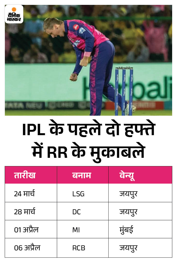 इंडियन प्रीमियर लीग के मौजूदा सीजन की शुरुआत 22 मार्च से हो रही है। राजस्थान की टीम अपना पहला मुकाबला 24 मार्च को लखनऊ सुपरजायंट्स के खिलाफ जयपुर में खेलेगी।