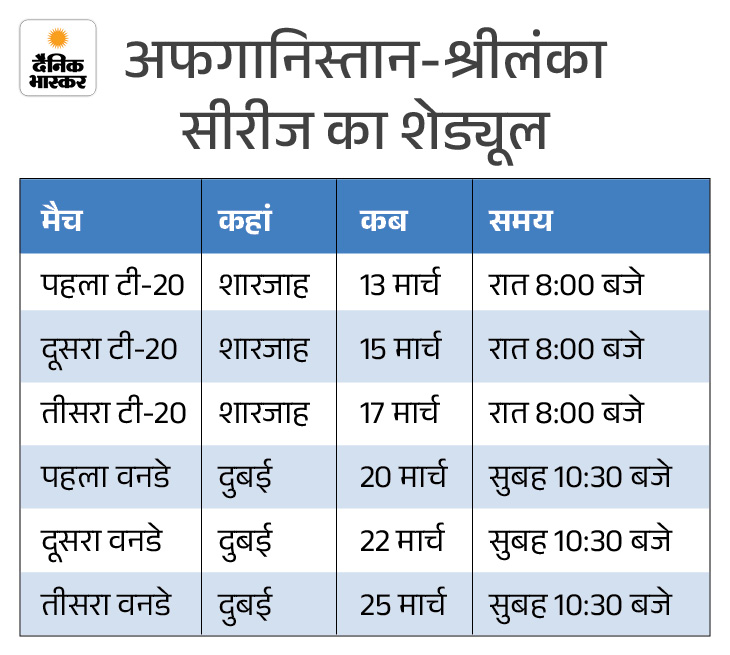 13 मार्च से शुरू होगी सीरीज 13 मार्च को होने वाले पहले मैच से टी-20 मुकाबले से सीरीज की शुरुआत हो होगी। सीरीज का दूसरा और तीसरा टी-20 मैच15 और 17 मार्च को खेले जाएंगे। टी-20 सीरीज के तीनों मैच शारजाह क्रिकेट स्टेडियम में खेले जाएंगे। इसके बाद 20 मार्च को होने वाले मुकाबले से वनडे सीरीज की शुरुआत होगी।