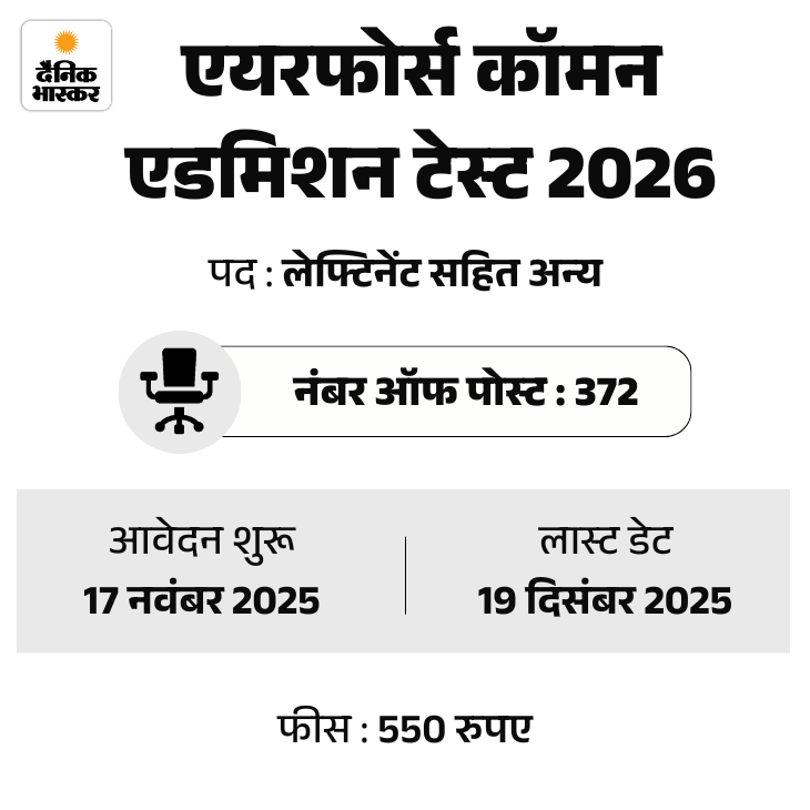 2. एयरफोर्स कॉमन एडमिशन टेस्ट 2026 के लिए आवेदन की आज आखिरी तारीख
