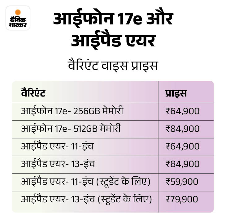 इसके अलावा, कंपनी ने अपडेटेड M4 प्रोसेसर के साथ नया आईपैड एयर भी पेश किया, जो पिछली जनरेशन के मुकाबले 30% फास्ट है। आईफोन 17e और आईपैड एयर की शुरुआती कीमत 64,900 रुपए है।