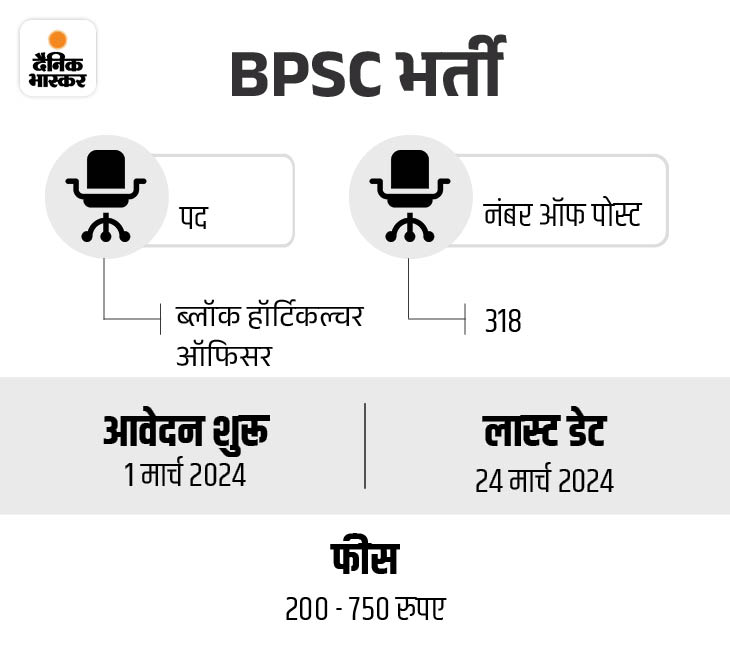 बिहार लोक सेवा आयोग (BPSC) की ओर से कृषि विभाग, बिहार पटना के अंर्तगत उद्यान निदेशालय के अधीन ब्लॉक हॉर्टिकल्चर ऑफिसर के पदों पर भर्ती चल रही है। पहले इस भर्ती के लिए आवेदन की आखिरी तारीख 21 मार्च 2024 थी जिसे अब 24 मार्च 2024 तक एक्सटेंड कर दिया गया है।