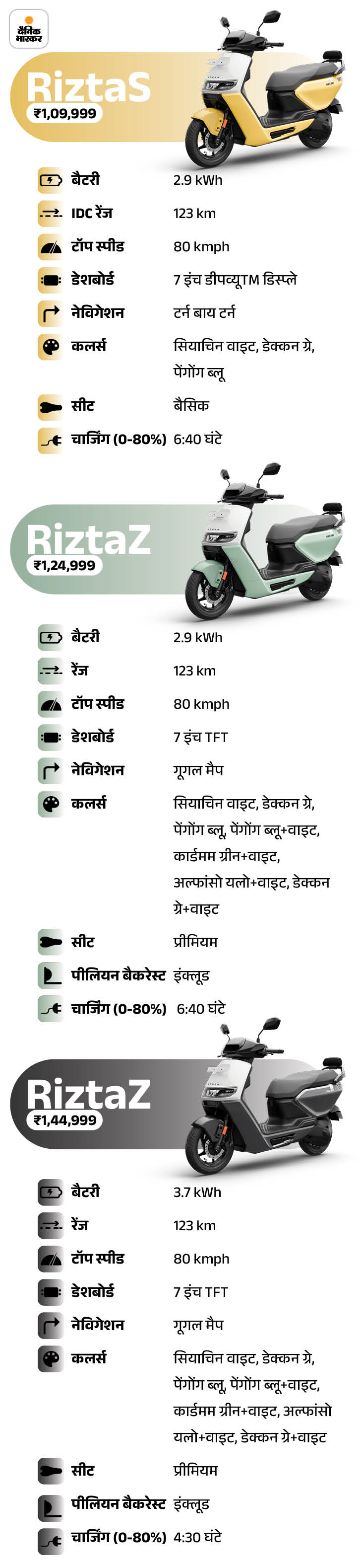 एथर रिज्टा को 2 वैरिएंट और 3 बैटरी पैक ऑप्शन के साथ पेश किया गया है। इसमें RiztaS (2.9 kWh बैटरी), RiztaZ (2.9 kWh बैटरी) और RiztaZ (3.7 kWh बैटरी) शामिल है। रिज्टा रेंज की शुरुआती कीमत 1,09,999 (एक्स-शोरूम बेंगलुरु) है। वहीं, टॉप वैरिएंट की कीमत 1.45 लाख रुपए (एक्स-शोरूम बेंगलुरु) है।