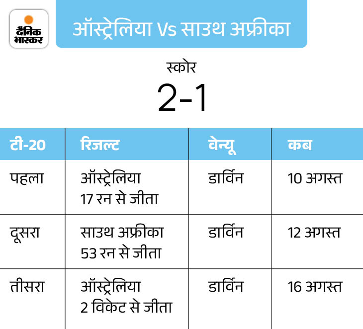 ऑस्ट्रेलिया ने टी-20 सीरीज 2-1 से जीती 3 दिन पहले 16 अगस्त को ऑस्ट्रेलिया ने 3 मैचों की टी-20 सीरीज 2-1 से अपने नाम की थी। कंगारुओं ने तीसरे और आखिरी मैच में को 2 विकेट से जीता था। इस मैच में ग्लेन मैक्सवेल ने फिफ्टी लगाई। साउथ अफ्रीका ने दूसरे टी-20 में 53 रन से जीत हासिल की थी। जबकि ऑस्ट्रेलिया ने पहला टी-20 मैच 17 रन से जीता था।