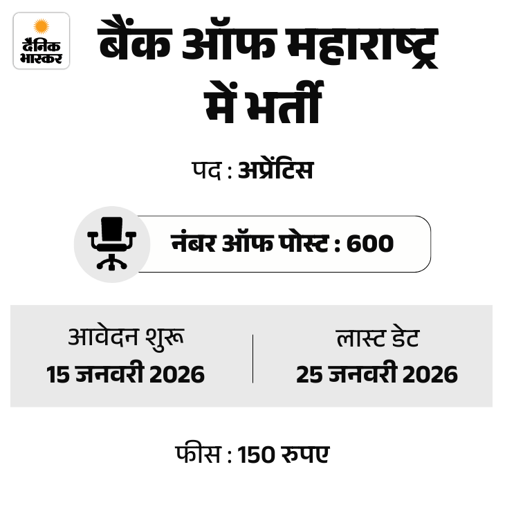 बैंक ऑफ महाराष्ट्र ने अप्रेंटिस के 600 पदों पर भर्ती निकाली है। इस भर्ती के लिए आवेदन की आखिरी तारीख 25 जनवरी तय की गई है। उम्मीदवार ऑफिशियल वेबसाइट bankofmaharashtra.in पर जाकर ऑनलाइन आवेदन कर सकते हैं।