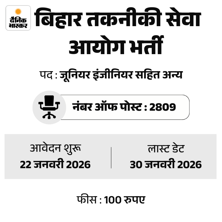 बिहार तकनीकी सेवा आयोग यानी BTSC ने राज्य के अलग-अलग विभागों में जूनियर इंजीनियर JE के 2,809 पदों पर भर्ती निकाली है। इस भर्ती के लिए आवेदन की आखिरी तारीख 12 जनवरी, 2026 थी। अब आज से दोबारा आवेदन शुरू किए गए है। लास्ट डेट 30 जनवरी तक के लिए बढ़ा दिया गया है।