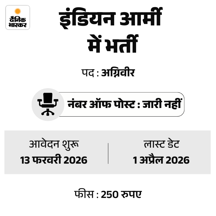 इंडियन आर्मी की ओर से अग्रिवीर भर्ती 2025 के लिए आज से आवेदन प्रक्रिया की शुरुआत की गई है। उम्मीदवार ऑफिशियल वेबसाइट joinindianarmy.nic.in पर जाकर अप्लाई कर सकते हैं।