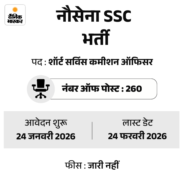 भारतीय नौसेना में शॉर्ट सर्विस कमीशन के तहत ऑफिसरों की भर्ती का नोटिफिकेशन जारी किया गया है। कुल 260 रिक्‍त पदों पर अफसरों की भर्ती की जाएगी। इस भर्ती के लिए आवेदन की शुरुआत 24 जनवरी से होगी। कैंडिडेट्स ऑफिशियल वेबसाइट joinindiannavy.gov.in पर 24 फरवरी तक आवेदन दर्ज कर सकते हैं।