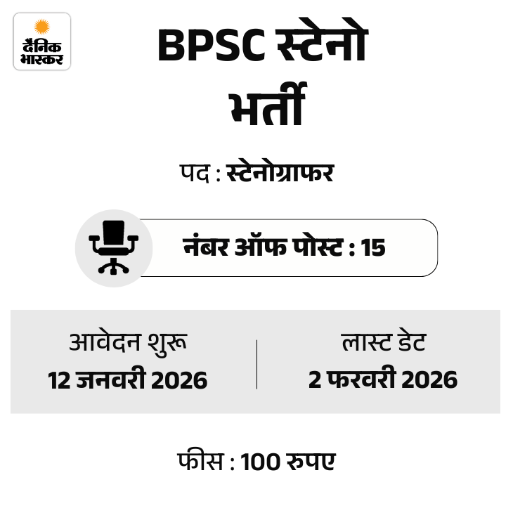 बिहार लोक सेवा आयोग ने स्‍टेनोग्राफर के 15 पदों पर भर्ती के लिए योग्‍य उम्‍मीदवारों से आवेदन मांगे हैं। इस भर्ती के लिए आवेदन की प्रक्रिया 12 जनवरी से शुरू होगी। कैंडिडेट्स ऑफिशियल वेबसाइट bpsconline.bihar.gov.in पर विजिट कर 2 फरवरी 2026 तक आवेदन कर सकते हैं।
