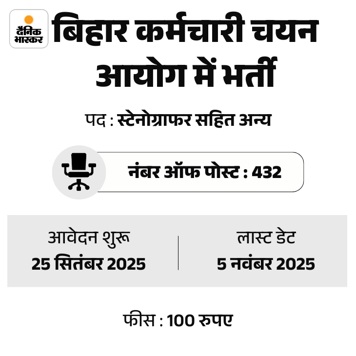 बिहार कर्मचारी चयन आयोग (BSSC) 2025 की ओर से स्टेनोग्राफर/स्टेनो टाइपिस्ट ग्रेड-III पदों पर भर्ती के लिए आवेदन मांगे गए हैं। इस भर्ती के लिए रजिस्ट्रेशन 25 सितंबर 2025 से शुरू होंगे। फीस जमा करने की आखिरी तारीख 3 नवंबर 2025 तय की गई है। उम्मीदवार BSSC की ऑफिशियल वेबसाइट onlinebssc.com पर जाकर आवेदन कर सकेंगे।