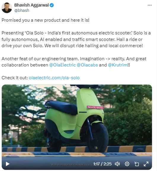 कंपनी के CEO भाविश अग्रवाल ने सोशल मीडिया प्लेटफार्म X पर लिखा,’आपसे एक नये प्रोडक्ट का वादा किया था और वह यहां है! पेश है ‘ओला सोलो – भारत का पहला ऑटोनॉमस इलेक्ट्रिक स्कूटर।’ सोलो एक पूरी तरह से ऑटोनॉमस, AI इनेबल्ड और ट्रैफिक स्मार्ट स्कूटर है। यात्रा करें या अपना खुद का सोलो वाहन चलाएं।