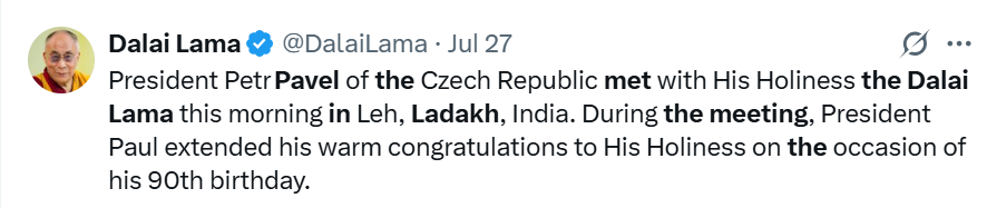 चेक गणराज्य के राष्ट्रपति पेट्र पावेल ने 27 जुलाई को दलाई लामा से मुलाकात की थी।