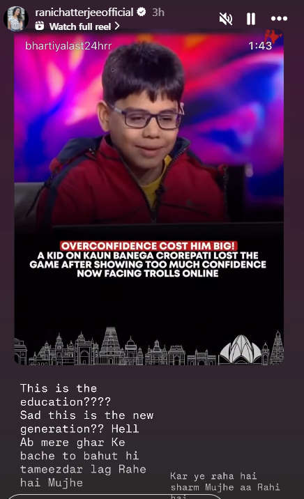 रानी चटर्जी ने अपने ऑफिशियल सोशल मीडिया अकाउंट से इशित भट्ट पर भड़कते हुए लिखा है, ‘क्या ये शिक्षा है? दुख की बात है कि ये हमारी अगली जनरेशन है। अब मेरे घर के बच्चे बहुत तमीजदार लग रहे हैं मुझे। कर ये रहा है शर्म मुझे आ रही है।’