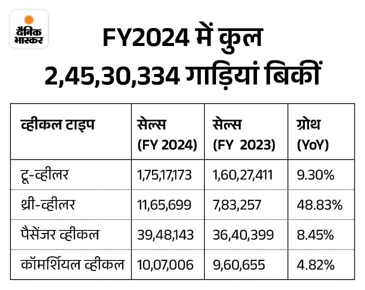 1. FY24 में 2.45 करोड़ से ज्यादा गाड़ियां बिकीं: 8 अप्रैल को फेडरेशन ऑफ ऑटोमोबाइल एसोसिएशन यानी FADA ने फाइनेंशियल ईयर 2024 और मार्च 2024 में बिकने वाली गाड़ियों की रिपोर्ट जारी कर दी है। इसके मुताबिक, FY24 में कुल 2 करोड़ 45 लाख 30 हजार 334 गाड़ियां बिकीं हैं, जो पिछले फाइनेंशियल ईयर से 10.29% ज्यादा है। FY23 में 2 करोड़ 22 लाख 41हजार 361 गाड़ियां बिकीं थीं।