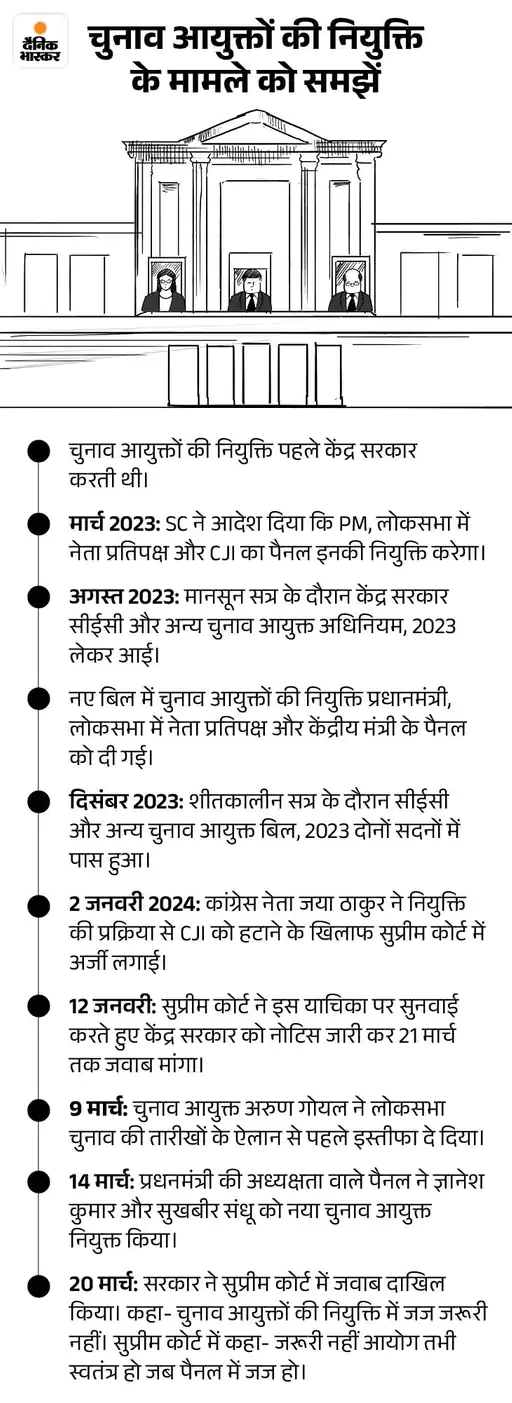 1. SC का चुनाव आयुक्तों की नियुक्ति पर रोक से इनकार: 21 मार्च को सुप्रीम कोर्ट ने 2 नए चुनाव आयुक्तों की नियुक्ति पर रोक लगाने वाली याचिकाएं खारिज कर दीं। जस्टिस संजीव खन्ना और जस्टिस दीपांकर दत्ता की बेंच के मुताबिक 2023 का फैसला नहीं कहता कि चुनाव आयुक्तों की नियुक्ति के लिए सिलेक्शन पैनल में ज्यूडीशियल मेंबर होना चाहिए।