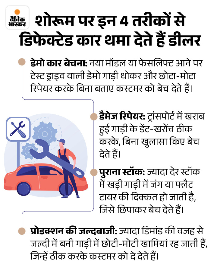 • छोटे-मोटे स्क्रेच को छुपाने के लिए डीलर कार को पॉलिश कर देते हैं। एक-दो बार वॉशिंग के बाद ये स्क्रेच दिखने लगते हैं।