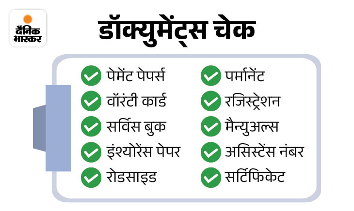 • कार के सभी पेपर्स जैसे- रजिस्ट्रेशन सर्टिफिकेट, इंश्योरेंस कवर, मैन्युअल्स, वारंटी कार्ड, रोडसाइड असिस्टेंस नंबर और सर्विस बुक चेक करें।