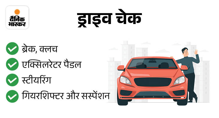 • डीलर रिप्रेजेंटेटिव के साथ एक बार टेस्ट ड्राइव जरूर लें। टेस्ट ड्राइव के दौरान कार की स्टीयरिंग, गियरशिफ्टर, ब्रेक और सस्पेंशन को चेक करें।