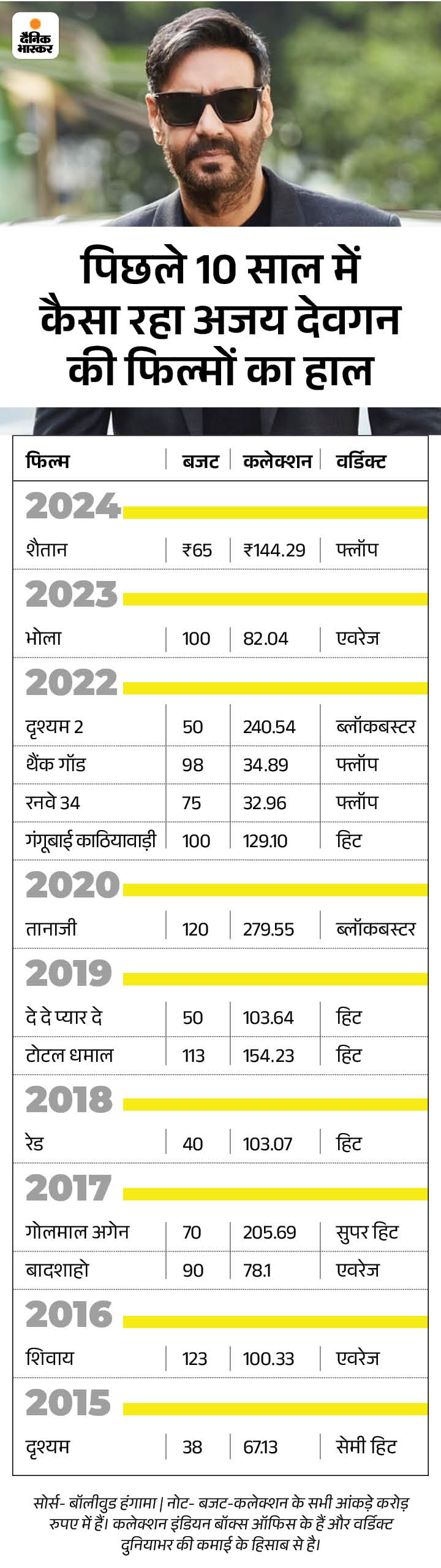 पिछले 10 साल में अजय की 14 फिल्में रिलीज हुई हैं, जिनमें से सिर्फ 3 फिल्में फ्लॉप रहीं। जबकि भोला, बादशाहो और शिवाय ने एवरेज कमाई की। वहीं, 1 फिल्म सुपरहिट और 1 सेमी हिट रही। अजय की दृश्यम 2 और तानाजी बॉक्स ऑफिस पर ब्लॉकबस्टर साबित हुई। साथ ही 4 फिल्में हिट की कैटेगरी में रहीं।