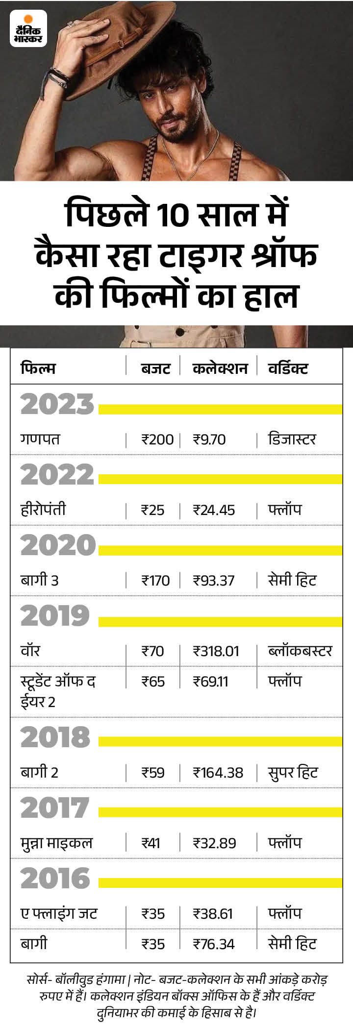 पिछले 10 साल में टाइगर श्रॉफ के करियर चार्ट पर नजर डालें तो उनकी सिर्फ 9 फिल्म रिलीज हुई हैं। किसी फिल्म का बजट 200 करोड़ से ज्यादा नहीं है। इन 9 फिल्म में से 5 फिल्म फ्लॉप रही हैं। वहीं, सिर्फ 2019 की वॉर ब्लॉकबस्टर रही है। बाकी बागी, बागी 3 सेमी हिट रही और बागी 2 सेमी हिट रही। सिर्फ 2023 में रिलीज हुई गणपत डिजास्टर साबित हुई।