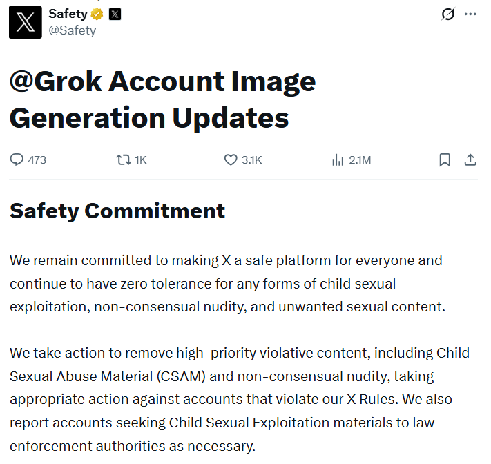 X के सेफ्टी अकाउंट ने गुरुवार इस बदलाव की जानकारी देते हुए बताया कि उन्होंने तकनीकी स्तर पर ऐसे बदलाव किए हैं, जिससे ग्रोक अब असली लोगों की बिना कपड़ों वाली फोटो नहीं बना पाएगा। इसमें बिकिनी जैसे कपड़ों वाली एडिटिंग पर पूरी तरह रोक लगा दी गई है।
