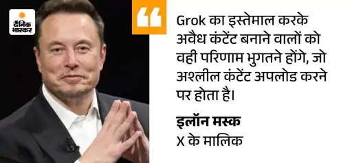 इससे पहले X के मालिक इलॉन मस्क ने कहा था कि कुछ लोग कह रहे हैं कि ग्रोक आपत्तिजनक तस्वीरें बना रहा है, लेकिन यह ऐसे है जैसे किसी बुरी बात को लिखने के लिए पेन को दोष देना। कलम यह तय नहीं करती कि क्या लिखा जाएगा। यह काम उसे पकड़ने वाला करता है।