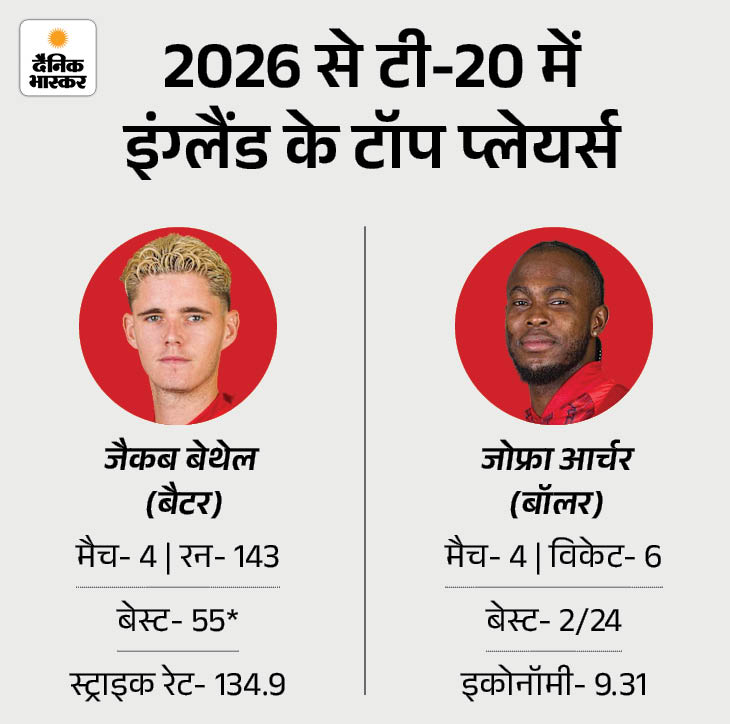 इस वर्ल्ड कप में जैकब बेथेल ने इंग्लैंड के लिए सबसे ज्यादा रन बनाए बनाए हैं। उनके नाम 4 मैचों में 134.9 के स्ट्राइक रेट से 143 रन हैं। इस दौरान 55 रन उनका बेस्ट स्कोर रहा। वहीं बॅालिग में जोफ्रा आर्चर इंग्लैंड के टॅाप विकेट टेकर रहे। उन्होनें 4 मैचों में 9.31 की इकोनॅामी से रन देते हुए 6 विकेट लिए।