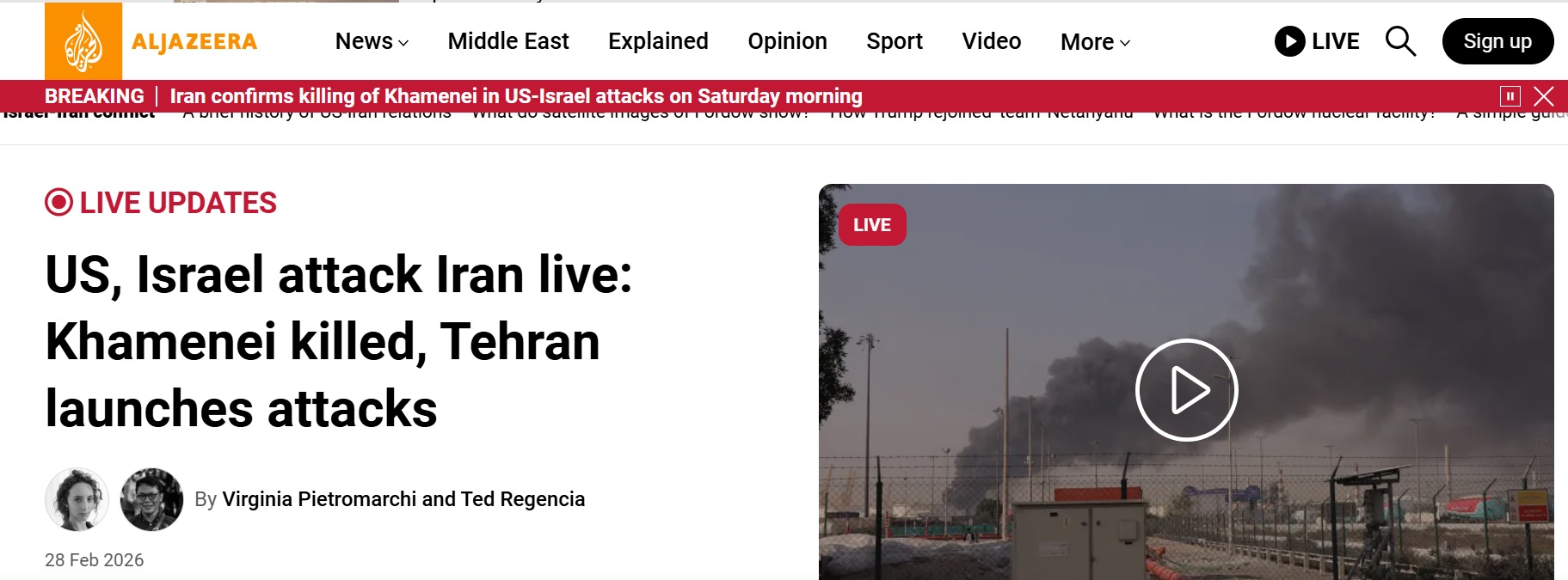 5. कतर मीडिया अलजजीरा: US, इजराइल ने ईरान पर हमला किया: खामेनेई की मौत, तेहरान ने हमले शुरू किए