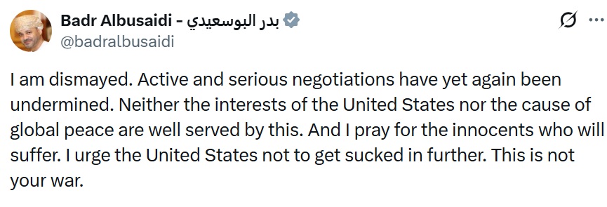5. ओमान बोला: अमेरिका यह आपकी जंग नहीं है, इसमें और न फंसें ओमान के विदेश मंत्री बद्र अल्बुसैदी ने X पर लिखा “मैं बहुत निराश हूं। चल रही गंभीर और सक्रिय बातचीत को एक बार फिर बिगाड़ दिया गया है। इससे न तो अमेरिका का कोई फायदा होगा और न ही दुनिया में शांति आएगी। मैं उन मासूम लोगों के लिए प्रार्थना करता हूं जिन्हें इसका खामियाजा भुगतना पड़ेगा। मैं अमेरिका से अपील करता हूं कि वो इसमें और न फंसे। यह आपकी जंग नहीं है।”