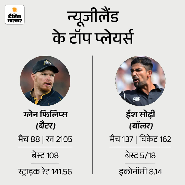 न्यूजीलैंड टीम के लिए ग्लेन फिलिप्स बल्लेबाजी में अहम भूमिका निभाते हैं। वे टी-20 वर्ल्ड कप स्क्वॉड में टीम के टॉप स्कोरर हैं। उन्होंने अब तक 88 मैच में 2105 रन बनाए हैं, जिसमें उनका हाई स्कोर 108 रन रहा है। उनके अलावा डेरिल मिचेल भी शानदार फॉर्म में हैं और पिछले 10 मैचों में उन्होंने सबसे ज्यादा 207 रन बनाए हैं। गेंदबाजी में ईश सोढी टीम की बड़ी ताकत हैं। उन्होंने 137 मैचों में 162 विकेट झटके हैं।