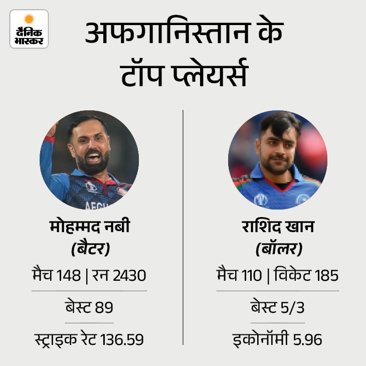 अफगानिस्तान के ओपनर इब्राहिम जादरान ने पिछले 9 मैचों में टीम के लिए सबसे ज्यादा 366 रन बनाए हैं। गुरबाज ने 9 मैचों में 143.33 की स्ट्राइक रेट से 301 रन बनाए हैं। वहीं, ओवरऑल रिकॉर्ड में मोहम्मद नबी टीम के टॉप स्कोरर हैं। उन्होंने 148 मैच में 2400 से ज्यादा रन बनाए हैं। बॉलिंग में कप्तान राशिद खान टॉप पर हैं।