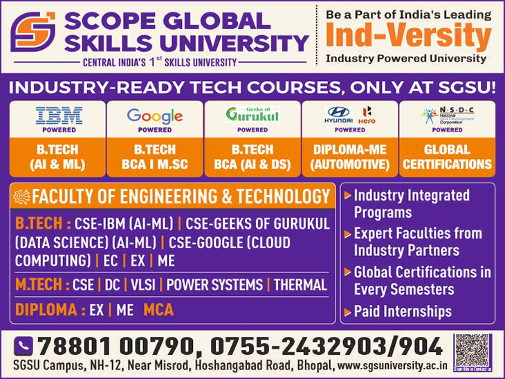 मध्य भारत की पहली स्किल-आधारित विश्वविद्यालय स्कोप ग्लोबल स्किल्स यूनिवर्सिटी (SGSU) ने 2025-26 सेशन के लिए प्रवेश की प्रक्रिया शुरू कर दी है। इस विश्वविद्यालय का उद्देश्य युवाओं को न केवल डिग्री, बल्कि उद्योग की जरूरतों के अनुरूप कौशल और वास्तविक अनुभव प्रदान करना है, ताकि वे सिर्फ नौकरी तलाशने वाले नहीं, रोजगार पैदा करने वाले बन सकें।