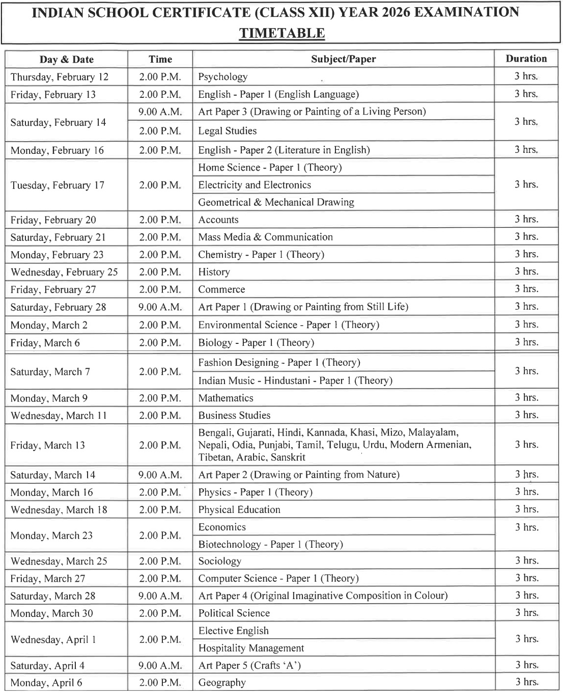 काउंसिल फॉर द इंडियन स्कूल सर्टिफिकेशन्स यानी CISCE ने गुरुवार, 13 नवंबर को बोर्ड परीक्षाओं की डेटशीट जारी कर दी है। ISC यानी 12 की परीक्षाएं 12 फरवरी, 2026 से शुरू होकर 6 अप्रैल, 2026 तक चलेगें। वहीं, ICSE बोर्ड 10वीं की परीक्षाएं 17 फरवरी, 2026 से शुरू होंगी और 30 मार्च, 2026 तक चलेंगी।