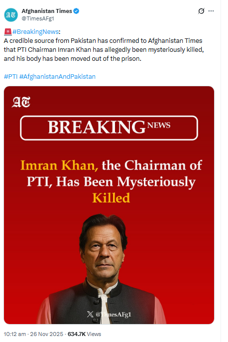 इस बीच, इमरान खान को लेकर सोशल मीडिया पर उनकी मौत की अफवाहें फैल गईं। कुछ पोस्ट में दावा किया गया कि उन्हें किसी दूसरी जगह ले जाया गया है। हालांकि इन दावों की आधिकारिक पुष्टि नहीं हुई है।