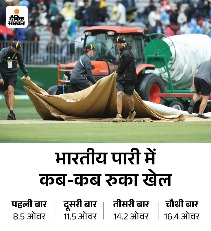 3. बारिश के कारण 4 बार रुका खेल पर्थ में बारिश के कारण पहले वनडे का खेल 4 बार रोका गया। चारों बार भारत की बैटिंग में ही बारिश ने खलल डाला। भारतीय समयानुसार सुबह 9.47 बजे पहली बार बारिश आई। तब टीम इंडिया ने 3 विकेट गंवा दिए थे। 10 बजे खेल शुरू हुआ।