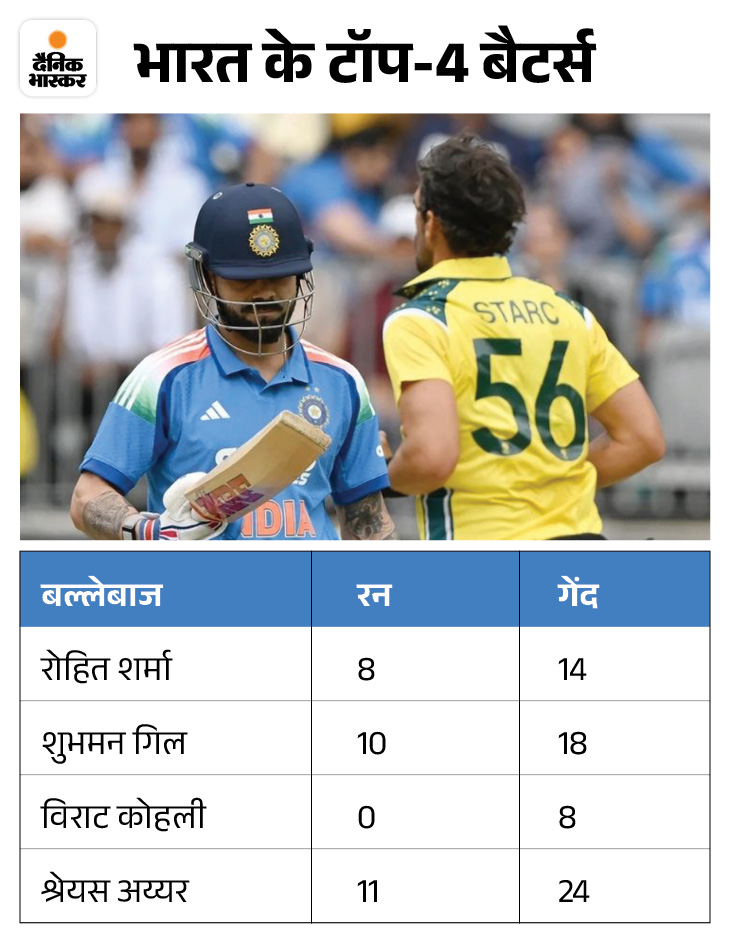 7 महीने बाद इंटरनेशनल क्रिकेट में वापसी कर रहे रोहित शर्मा 8 और विराट कोहली शून्य पर आउट हो गए। ऑस्ट्रेलिया के खिलाफ रविवार को पर्थ में भारत की शुरुआत हार से हुई। ऑप्टस स्टेडियम में होम टीम को पहली ही जीत मिली।